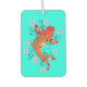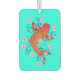Pescado koi de estilo naranja oriental, rodeado de flores rosas sobre un fondo turquesa.