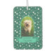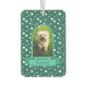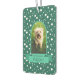 Enmarcar una foto vertical de su mascota en un marco clásico de arco en verde azulado con un cartel para su nombre. El fondo son los puntos de polka blancos en verde azulado.