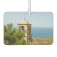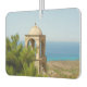 Detalle del campanario con pinos y vistas al mar en una isla mediterránea