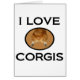 Un lindo círculo redondo con una fotografía de un lindo culo de conejito de corgi y sus piernas estiradas detrás de ella con las palabras ME ENCANTA EL CORGIS. A los dueños de Corgi, mamá y padres por igual les gustará esta graciosa tarjeta de corgi.