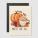 Celebre las cálidas y acogedoras vibraciones de la caída con esta tarjeta de saludo "I Love Fall Of All", que incluye una calabaza de leche de especias, calabazas y hojas de otoño. Esta encantadora y festiva obra de arte captura perfectamente la esencia del clima de sudor, el aire fresco y todo lo relacionado con las especias de calabaza. Ideal para los amantes del otoño, los amantes del café, los albornoces otoñales y los regalos de temporada, este diseño es imprescindible para todo aquel que disfrute de los sabores y la belleza de la temporada de otoño.
