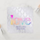 Diseño de texto floral sobre diseño satinado blanco con textura arcoiris gradiente