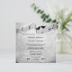 Invitación a la boda en blanco y negro con un tema musical que incluye dos pájaros amorosos cantantes en cables de estilo musical. El fondo es de un estilo suave y gris con encaje. Puede personalizar, arrastrar o eliminar campos de texto. También es posible cambiar fuentes y más. Para todas las opciones, elija "personalizar".