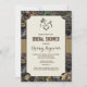 Las invitaciones a la ducha nupcial de Love Deer Hunting Camo - presenta una banda rústica impresa de la burlap que se envuelve por el frente y por la parte trasera con un fondo de camuflaje de caza. Un dólar y un perro están en la parte superior, formando un corazón.