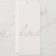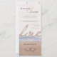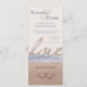 Esta delgada invitación a la boda muestra una foto de dos corazones bajo una ola oceánica en la arena. La palabra "amor" en una letra de guión separa la foto del resto de la simple invitación color crema, donde las palabras azul oscuro del océano en una fuente clásica de grabado invitan a los invitados a su boda. Todo el texto excepto "amor" es personalizable en la invitación.