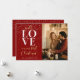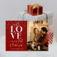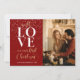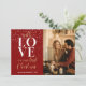 Esta "Tarjeta navideña de amor rojo primero, señor y señora guión fotográfico" para los recién casados es el recuerdo perfecto para celebrar su primera fiesta como pareja casada. La carta desprende calidez y amor, con una foto de una pareja de personalizables, en un interior acogedor y festivo. El punto central es una gran y elegante palabra blanca "Amor" escrita con letras sofisticadas, que simboliza el vínculo de la pareja. Para complementar esto, la frase "Nuestra primera Navidad" se destaca en un lujoso guión de color dorado sobre un rico fondo rojo, realzado por una ráfaga de nieve para un toque festivo. Una hermosa mezcla de romance y espíritu festivo, esta tarjeta es ideal para recién casados que celebran su primera Navidad juntos.