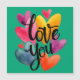 Una ilustración en acuarela alegre, expresiva emocionalmente y bellamente representada, adecuada para tarjetas de felicitación, gráficos digitales y mensajes románticos o amistosos. La imagen presenta la frase "Love You" escrita en una caligrafía de pincel negro audaz y casual superpuesta sobre un grupo de corazones de colores brillantes. Los corazones están representados en una textura vibrante de acuarela utilizando colores diversos y saturados como amarillo, magenta, turquesa, rosa y naranja.