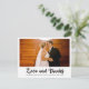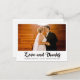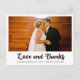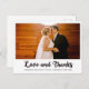 Muestra amor y agradecimiento a tus invitados de boda con esta elegante tarjeta postal de agradecimiento de foto de boda moderna. Una hermosa fotografía de recién casados encima de la bella escritura cursiva negra y tus detalles personalizados en esta tarjeta minimalista de moda.