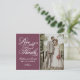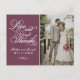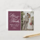 La sencilla y elegante tarjeta de agradecimiento de boda cuenta con "Amor y Gracias" en una hermosa tipografía de letra cursiva con monograma personalizado y una foto de la novia y el novio en el anverso, y una foto cuadrada más pequeña con texto personalizable en el reverso. El color de fondo del vino tinto borgoña se puede personalizar para coordinar con el esquema de colores de su boda.