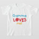 Amores gammas yo camisetas, tarjetas, pegatinas, bolsos de los monos, y más con diseño rojo, amarillo, y azul colorido del texto y del corazón. ¡Este la gamma me ama ropa y los artículos del regalo harán sonrisa gamma!