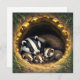 Tarjeta en blanco con un ilustracion ai de una madre insignia y sus bebés, todos echando una siesta en su túnel subterráneo llamado set.