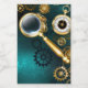 Una lupa antigua con mango dorado y lente convexa sobre el fondo verde con los engranajes dorados y un reloj antiguo. Estilo Steampunk.