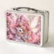 A pretty pink and gold anime elven fairy holding her cute white baby dragon lunch box.