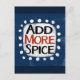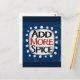 Una tipográfica chunky y tipográfica que dice "Añadir más especias". Tiene texto en negro y rojo sobre un rectángulo blanco con puntos blancos divertidos y juguetones rodeándolo, todo sobre un fondo azul.