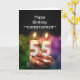 Quemando velas de pastel de 55 años en forma de números encima de un quequito de chocolate. Personalizar con el nombre de la persona de cumpleaños. Adecuado para un hombre o una mujer. Ver toda la gama de tarjetas para edades y relaciones en mi tienda. Todos los derechos de autor de arte Norma Cornes