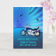 Feliz cumpleaños con una moto. Una tarjeta perfecta para un ciclista. Una moto azul con una puesta de sol estilizada y pájaros voladores. A cualquier aficionado a la bicicleta le encantará conseguir una tarjeta como esta. Añadir un nombre para personalizar esta tarjeta. ¡personalizar con cualquier nombre!
