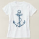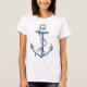 Gráfico Náutico Ancla Tee Blanco Azul. Dibujo vectorial de ancla azul marino, gráfico en una camiseta blanca (¡puedes seleccionar otros colores de camisetas, estilos y tamaños!) Diseño de camisetas de apariencia Guay para el verano, para tus vacaciones y para todo aquel que ame el mar, el océano, la vela, los barcos, los barcos, etc.