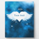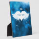 Crea tu propia placa de presentación conmemorativa personalizada. Un encantador regalo de personalizado del corazón para cualquiera que llore la pérdida de un ser querido cuando no tienes las palabras para expresar cómo te sientes. Hermosas alas ángel de plumas blancas con un corazón blanco entre y un halo por encima. Tiene un rayo de luz brillando desde arriba y 3 corazoncitos flotantes bajo un fondo nocturno azul y negro estrellado. También es apto para el monumento a los mascotas. Puede ser personalizado/personalizado con el nombre de su ser querido.