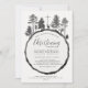 Esta rústica invitación a la cristalización tiene un fondo de arboles y está decorada con un paisaje de bosques que incluye ciervos y pinos.