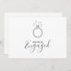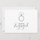 Anuncia tu compromiso con esta encantadora tarjeta que presenta un estilo de dibujo lineal juguetón de un elegante anillo de diamantes sobre un fondo blanco minimalista. Las hermosas fuentes de escritura resaltan el mensaje "Estamos comprometidos" y sus nombres, mientras que el espacio debajo le permite personalizar los detalles de la fiesta, la fecha y la información de la celebración para que se adapte a su día especial. La combinación de ilustración divertida y tipografía sofisticada ofrece una forma fresca y memorable de compartir sus felices noticias.