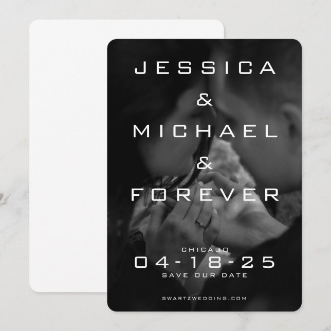 Esta es una mínima tarjeta moderna para guardar la fecha, centrada en los nombres de la pareja, colocando una foto de la pareja con todo el sangrado mostrando el anillo de compromiso.