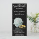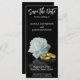 Elegante ilustracion de diseño con una rosa blanca y dos anillos bodas dorados sobre un fondo negro. Guarde el Compromiso de Fecha con letra moderna de guión de caligrafía.