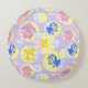 Una almohada violeta redonda con animales de juguete lindos flotando en burbujas de gingham.
