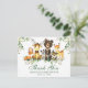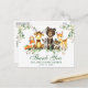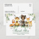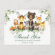 Tarjeta Postal de Agradecimiento para Baby Shower Animales del Bosque Acuarela. Los animales bebé incluyen Oso, Ciervo, Alce, Mapache, Conejo, Zorro y Búho sobre hojas de eucalipto y follaje verde del bosque. Letra verde.