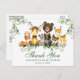 Tarjeta Postal de Agradecimiento para Baby Shower Animales del Bosque al Acuarela. Los animales bebé incluyen Oso, Ciervo, Alce, Mapache, Conejo, Zorro y Búho sobre hojas de eucalipto y follaje verde del bosque. Letra verde.