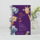 ¡Diviértete con esta divertida invitación de cumpleaños de los animales del zoológico personalizado! El diseño muestra una serie de adorables criaturas de la jungla, incluyendo un elefante, un tigre, una jirafa y un hipopótamo, asomándose con expresiones curiosas. Esta invitación rebosa de personalidad y encanto, con un fondo violeta y audaz. Es la manera ideal de invitar a amigos y familiares a la fiesta de cumpleaños de un niño, prometiendo una celebración llena de risas y diversión. Haz de la fiesta de cumpleaños de tu pequeña una extraordinaria jungla con esta encantadora y alegre invitación.
