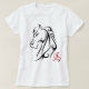 Obra artística del caballo negro con el símbolo del personaje chino rojo para el caballo. Este diseño se ve mejor en camisetas blancos o de color claro. El Año del Caballo es de acción, aventura, viaje y romance. El caballo también representa progreso, carisma, trabajo productivo, energía solar y libertad. Si naciste en un año del Caballo eres encantador, social, confiable y de mente abierta. Puedes ser extravagante y a menudo eres la vida del fiesta. El Caballo es un animal de poder para muchas personas, incluidos empresarios, viajeros, atletas, constructores e ingenieros, artistas e intérpretes, gente en ventas u ocupaciones de orientación social, aquellos que trabajan cerca (o con) la Tierra. En astrología china, el caballo es un símbolo de fuego y está asociado con el número siete.
