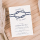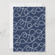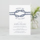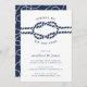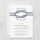 Las invitaciones a los bodas de moda costera para la cena presentan un estilo náutico clásico en azul marino y blanco. "Antes de atar el nudo" aparece en la parte superior, curvada alrededor de un ilustracion de cuerda nuboso azul marino. Personalice con sus detalles de la cena de ensayo debajo de una combinación de moda de letras de serif y sans serif. Perfecto para cenas náuticas, de temática playera o de verano. Las tarjetas cambian a un patrón de cuerda náutica en blanco sobre la marina.