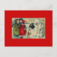 Tarjeta de Navidad antigua en fondo rojo brillante en la postal. Demostraciones tres chicas jóvenes, un perro curioso y un muñeco de nieve mágico. (Escarchado quizás)