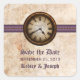 Estos antiguos Pegatinas Save the Date cuentan con una pieza vintage destacadamente centrada en la parte superior de una metalizado cadena de bolas y un elegante borde de rayas violetas. El aspecto angustiado del fondo de textura de papel grueso completa el ambiente anticuado de este diseño único. Estos "offbeat" ahorran la fecha pegatinas perfectos para anunciar su boda de inspiración vintage o steampunk. Fácil de personalizar, simplemente añada los detalles de su boda en los espacios proporcionados. Haga clic en "Personalizar" para encontrar opciones adicionales para personalizar este diseño.