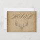 Rústicas Antlers de venado cazando tarjetas RSVP de boda con una silueta montada de antler de venado sobre un desvanecido fondo vintage de la huella de la quemadura. Son ideales para cazar bodas temáticos. Simplemente agregue su propia información a la plantilla de la tarjeta de respuesta. tarjetas rsvp de caza, tarjetas rsvp de boda de ciervo antler, tema de vida silvestre, tema de caza, tarjetas rsvp de boda rústica, tarjetas rsvp de boda rural, huella de toronja