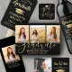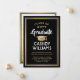 Comparte la alegría de una graduación de secundaria o universitaria con estas fotos personalizados de invitaciones negras, doradas y blancas. (IMAGEN PLACEMENT TIP: Una manera fácil de centrar una imagen exactamente como se desea es recortarla antes de subirla al sitio web de Zazzle.) Esta plantilla incluye el nombre del graduado, el año de clase y la escuela, así como cualquier texto de su elección, como detalles de la invitación de partido, honores especiales, título de grado, presupuesto inspirador favorito, información de contacto del graduado, planes de educación futuros o nueva posición laboral. Todo el texto es sencillo de personalizar. El diseño presenta un moderno borde de Relieve metalizado de oro falso y una tapa de tablero de mortero, una caligrafía de escritura elegante, tipografía tradicional y una foto de su elección, como una foto de la parte superior o una imagen de la ceremonia de inicio. Tenga en cuenta que el oro es color impreso, no Relieve metalizado metálico. Estas tarjetas de invitación de graduación son una manera moderna y moda de compartir tu celebración especial del día con familiares y amigos. ¡Felicitaciones al graduado!