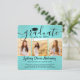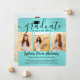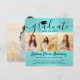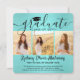 Comparte la alegría de una graduación de escuela secundaria o universidad para ella con estos anuncios personalizados cuadrados de 4 fotos collage en azul turquesa y negro. Todas las imágenes y textos son fáciles de personalizar. (CONSEJO DE UBICACIÓN DE IMAGEN: Una forma fácil de centrar una foto exactamente como la deseas es recortarla antes de subirla al sitio web de Zazzle.) Esta plantilla se puede personalizar con cualquier detalle que elijas, como información de invitación a la fiesta, nombres de los padres, honores especiales, título del grado, cita inspiradora favorita, información de contacto del graduado, planes de educación futura o nuevo puesto de trabajo. El diseño cuenta con un fondo de lámina falsa turquesa / azul turquesa, gorra de graduación negra, caligrafía de estilo manuscrito, tipografía minimalista moderna y cuatro fotos de tu elección, como fotos de último año o imágenes de la ceremonia de graduación. Ten en cuenta que el azul turquesa rosado es el color impreso, no lámina metálica. Estas elegantes tarjetas de anuncio de graduación son una forma moderna y chic de compartir la celebración de tu