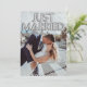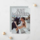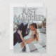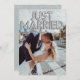 Este anuncio de boda personalizado presenta un diseño de foto personalizado divertido y romántico. La frase "Recién casados" está impresa en la parte superior con globos de papel de aluminio plateado. Una foto de muestra de una novia y un novio cubre el fondo que puede personalizar para incluir su propia foto personalizada de la pareja casada, o otra imagen de su elección. El confeti plateado acentúa las partes superior e inferior. Un mensaje de anuncio de boda de muestra está impreso en el reverso.