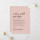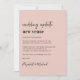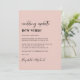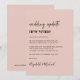 Anuncio de cambio de lugar de boda minimalista moderno rosa claro con "actualización de boda nuevo lugar" escrito en una mezcla de tipografía de moda en negrita y script (puedes personalizar esto a "nueva fecha", "boda más pequeña", etc). Personaliza tu mensaje de cambio de planes, agrega tus nombres en un script tipo firma y agrega tu sitio web de boda en el reverso o déjalo en blanco.