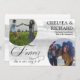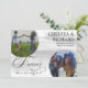 Dos fotos circulares de diseño único "Forever tiene un bonito anillo" invitación de compromiso de caligrafía de texto del guión. En la parte frontal se muestran sus fotos, nombres, ubicación y fecha (o por anunciarse o determinarse) en un fondo acuático y en la parte posterior se muestra su mensaje único a la familia y amigos en un fondo acuarela. Tonos grises con texto negro suave. Diseño compuesto por diseños de Holiday Hearts con fotos de marcador de posición proporcionadas por Unsplash.