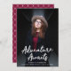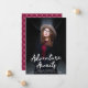 Anuncios de graduación a la moda mostrando la foto vertical del graduado con "Adventure Awaits" en letras manuscritas blancas. Personalice la parte delantera de la Adventure Aits con los anuncios de graduación añadiendo el nombre del graduado, el nombre de la escuela y el año de graduación. La invitación se invierte para mostrar un elegante patrón de enrejado en blanco y borgoña.