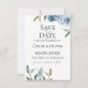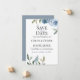 Flores de acuarela azul polvoriento con follaje botánico de jardín, tarjeta de guardar la fecha de la boda.