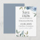 Flores de acuarela azul polvoriento con follaje botánico de jardín, tarjeta de guardar para la boda.