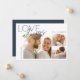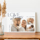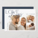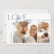 Una elegante tarjeta de invitación de compromiso de collage de fotos con tres fotos (una cuadrada y dos horizontales), con "amor siempre" en bloques modernos y letras de guiones a lo largo de la parte superior e izquierda. Personalice el mensaje de su personalizado (mostrado con "¡estamos comprometidos!") y sus nombres.