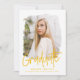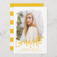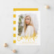 Anuncios de graduación a la moda mostrando la foto del graduado dentro de un marco de máscara texturizada con "Graduado" en un guión manuscrito amarillo. Personalice la parte delantera de los anuncios de graduación con fotos agregando el nombre del graduado, el nombre de la escuela y el año de graduación. La invitación se invierte para mostrar un diseño de rayas amarillas y blancas.