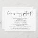 Anuncio minimalista moderno en blanco y negro de aplazamiento de boda y cambio de planes. "el amor es muy paciente" está escrito en una elegante y chic letra y puedes personalizar fácilmente si la fecha de la boda se ha pospuesto o si se han cambiado otros detalles.