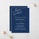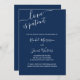 Tarjeta de anuncio de aplazamiento de boda con paleta de colores azul marino y blanco minimalista. "El amor es paciente", junto con los nombres de la novia y el novio, está escrito a mano en elegante letra cursiva. La plantilla está configurada para que puedas personalizar tu mensaje de actualización de la boda según tus necesidades. El texto de ejemplo dice "debido a eventos recientes, la boda de [tus nombres] ha sido pospuesta. Te avisaremos tan pronto como fijemos una nueva fecha. Fue una decisión difícil y agradecemos tu comprensión" - que puedes mantener o editar como desees.