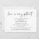 Anuncio minimalista moderno en blanco y negro de posposición de boda y cambio de planes. "el amor es muy paciente" está escrito en una elegante y chic letra y puedes personalizar fácilmente si la fecha de la boda ha sido pospuesta o si se han cambiado otros detalles.