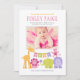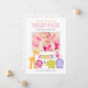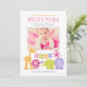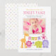 Un grupo de amigos animales de la jungla, incluyendo un león, jirafa, pájaro, mono, elefante e hipopótamo, se reúnen para dar la bienvenida a la niña en esta dulce tarjeta de anuncio de nacimiento con tema de safari. El diseño horizontal presenta una foto enmarcada por acentos de patrones de puntos y rayas sobre un fondo blanco con una franja de encabezado verde. Colores vibrantes magenta rosa, rosa claro, verde, naranja y púrpura. Todo el texto es totalmente personalizable.