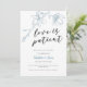 Tarjeta de anuncio de aplazamiento de boda elegante y moderna con una ilustración dibujada a mano de flores de magnolia en color azul polvoriento con un texto en letra script debajo que dice "el amor es paciente".